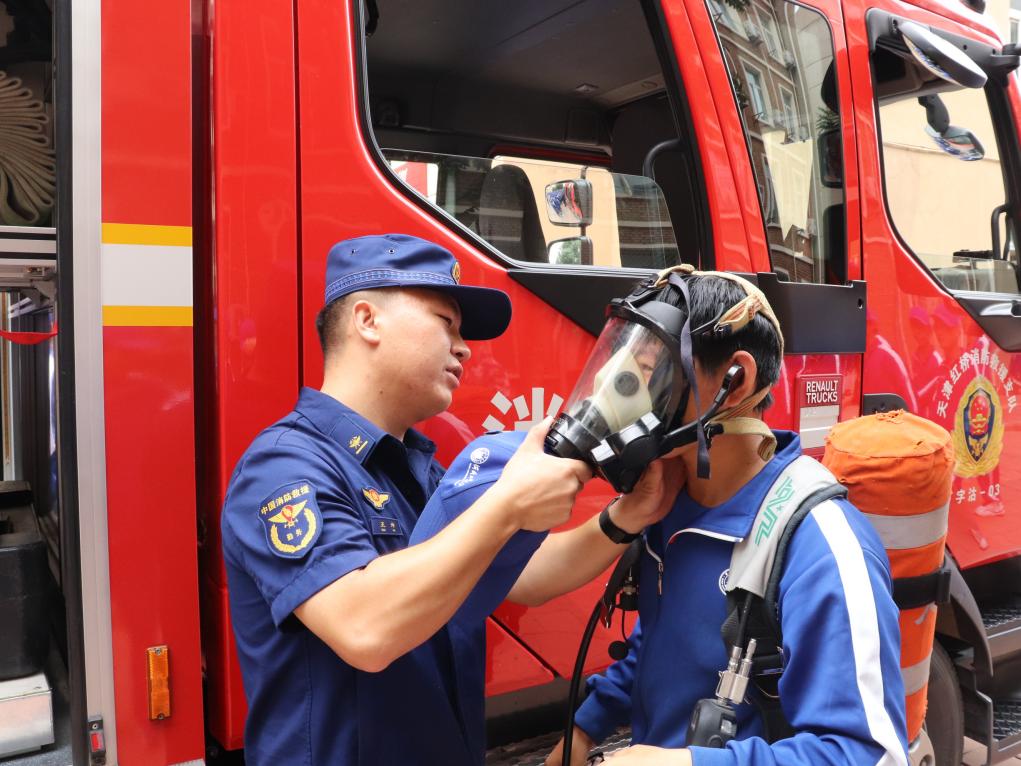 理論講解結(jié)束后,新生們列隊參與了消防裝備體驗環(huán)節(jié)。新生們有序來到消防裝備展示區(qū),近距離參觀專業(yè)救援車輛。消防官兵打開車廂逐一介紹各類裝備的功能用途,部分新生代表親身參與裝備體驗,親手觸摸消防水帶、破拆工具等專業(yè)器材,嘗試佩戴過濾式綜合防毒面具、穿戴滅火防護服,真切感受消防裝備的專業(yè)性與實用性。